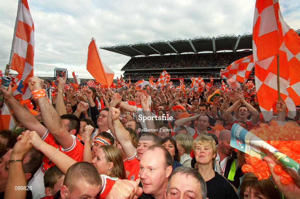 22 September 2002; Armagh supporters celebrate on the field following their side's victory in the GAA Football All-Ireland Senior Championship Final match between Armagh and Kerry at Croke Park in Dublin. Photo by Damien Eagers/Sportsfile