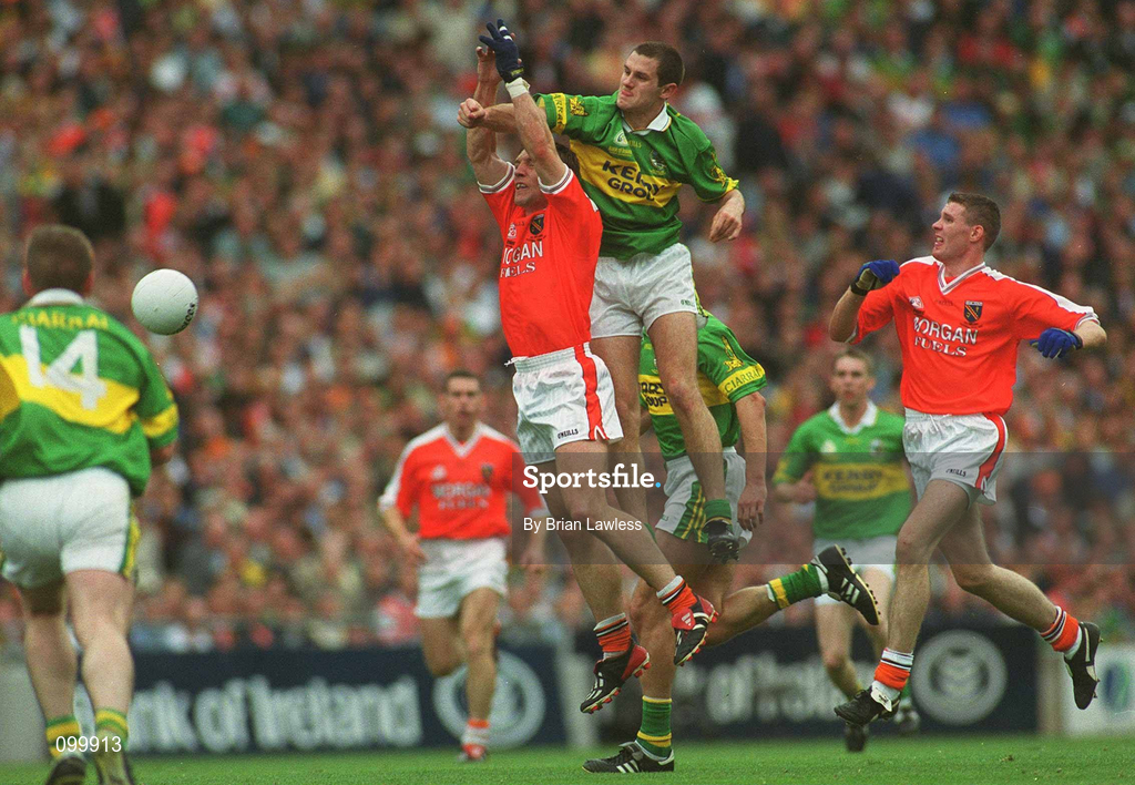 22 September 2002; Eoin Brosnan of Kerry in action against Kieran McGeeney of Armagh during the GAA Football All-Ireland Senior Championship Final match between Armagh and Kerry at Croke Park in Dublin. Photo by Brian Lawless/Sportsfile