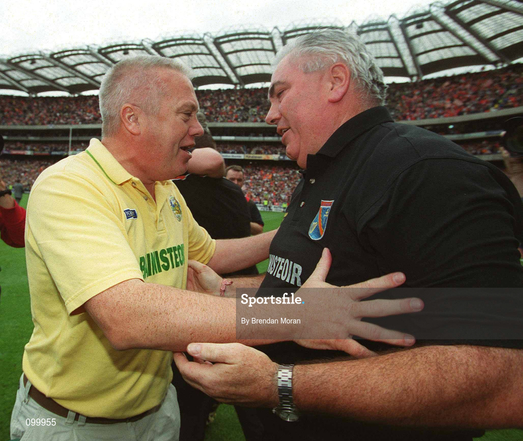 22 September 2002; Kerry manager Paidi O Se, left, congratulates Armagh manager Joe Kernan following the GAA Football All-Ireland Senior Championship Final match between Armagh and Kerry at Croke Park in Dublin. Photo by Brendan Moran/Sportsfile