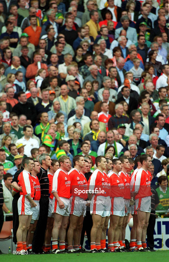 22 September 2002; The Armagh team stand together for the National Anthem prior to the GAA Football All-Ireland Senior Championship Final match between Armagh and Kerry at Croke Park in Dublin. Photo by Damien Eagers/Sportsfile