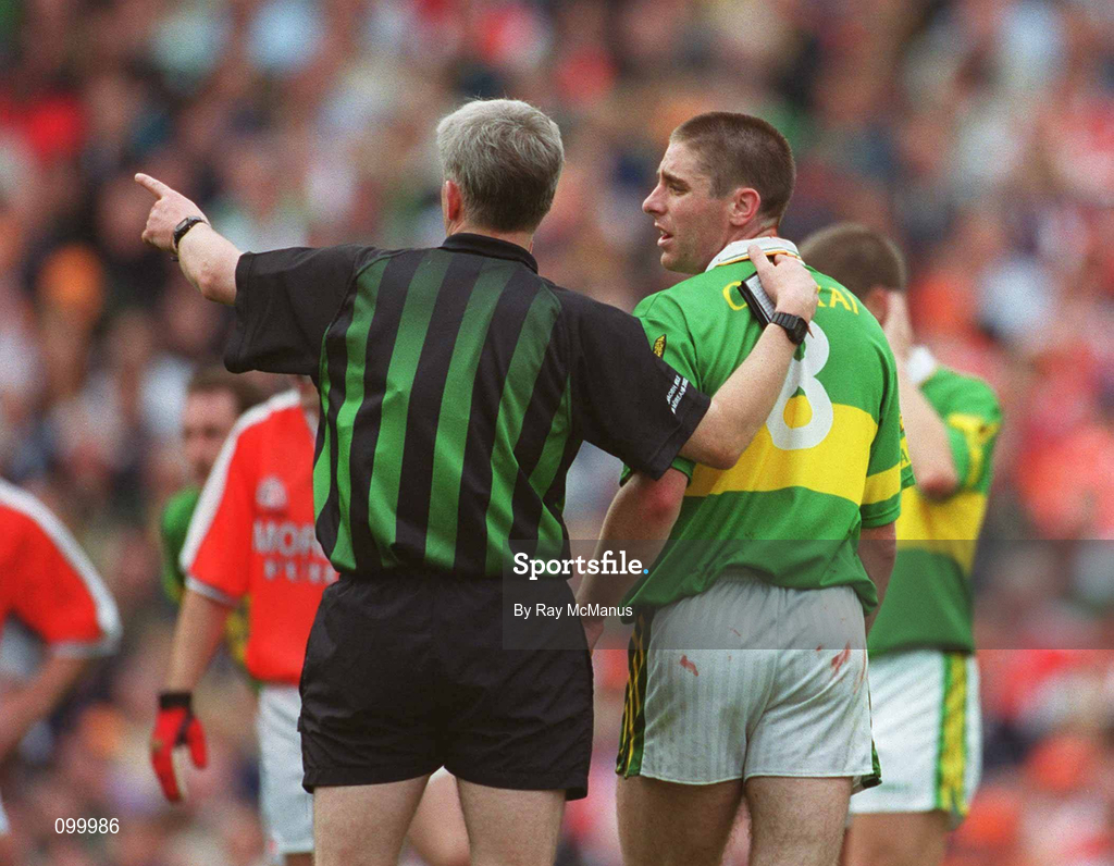 22 September 2002; Darragh O Se of Kerry is spoken to by referee John Bannon during the GAA Football All-Ireland Senior Championship Final match between Armagh and Kerry at Croke Park in Dublin. Photo by Ray McManus/Sportsfile