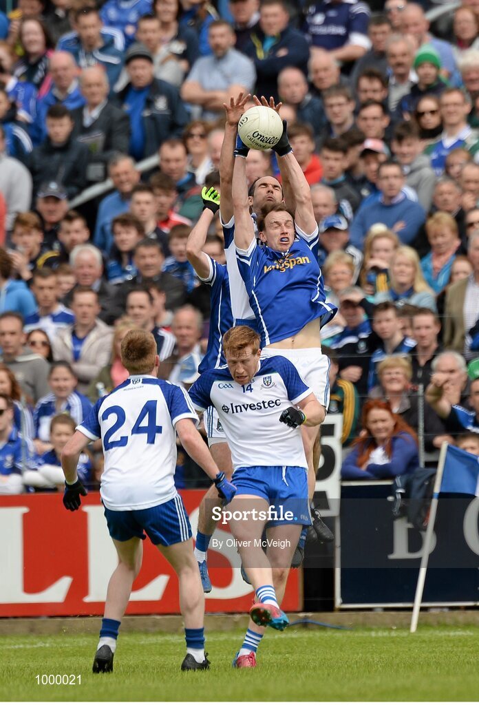 24 May 2015; Martin Reilly of Cavan contest a high ball with Paul Finlay of Monaghan during the Ulster GAA Football Senior Championship Quarter-Final match between Cavan and Monaghan at Kingspan Breffni Park, Cavan. Photo by Oliver McVeigh/Sportsfile