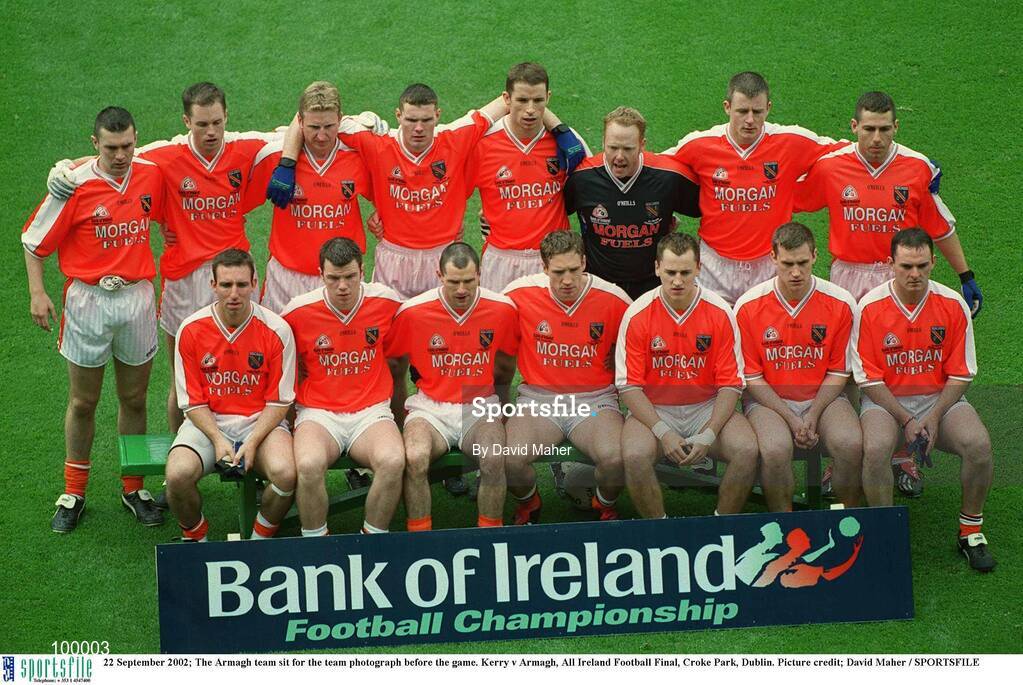 22 September 2002; The Armagh team sit for the team photograph prior to the GAA Football All-Ireland Senior Championship Final match between Armagh and Kerry at Croke Park in Dublin. Photo by David Maher/Sportsfile