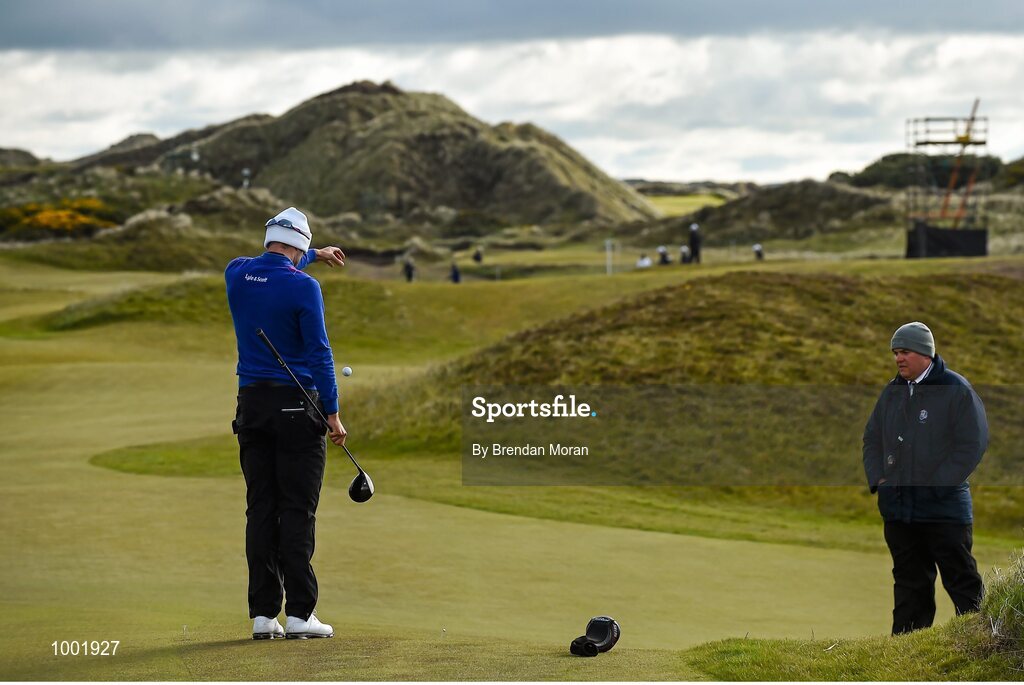 29 May 2015; Seve Benson, England, watched by a rules official, takes a drop on the 5th green where his ball landed after his tee shot from the 2nd tee box. Dubai Duty Free Irish Open Golf Championship 2015, Day 2. Royal County Down Golf Club, Co. Down. Picture credit: Brendan Moran / SPORTSFILE