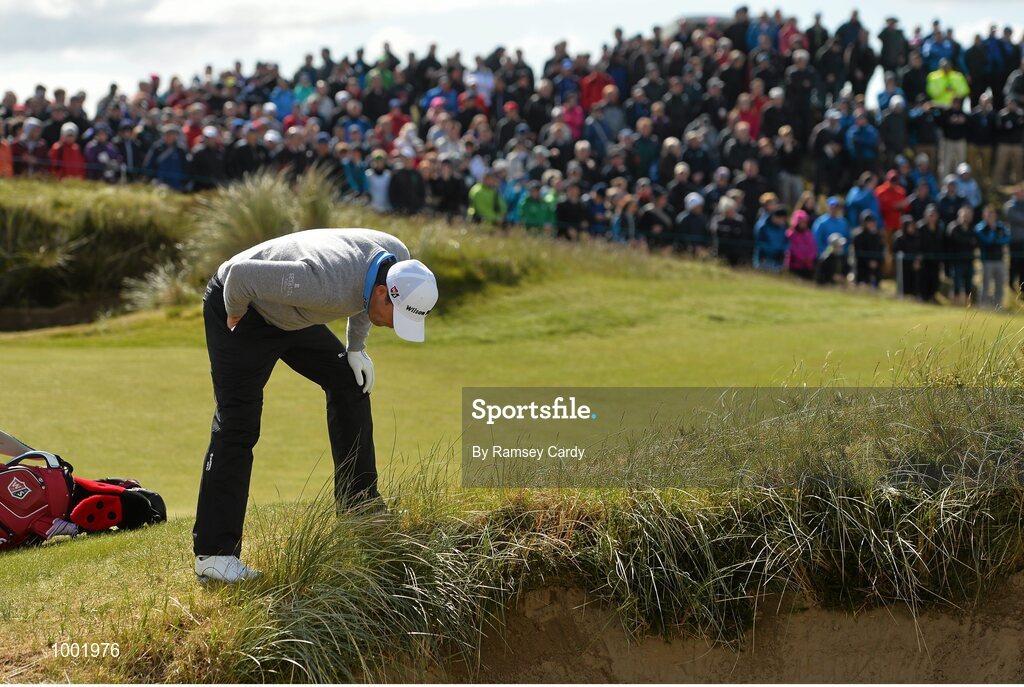 29 May 2015; Padraig Harrington, Ireland, looks for his ball in the bunker on the 18th hole. Dubai Duty Free Irish Open Golf Championship 2015, Day 2. Royal County Down Golf Club, Co. Down. Picture credit: Ramsey Cardy / SPORTSFILE