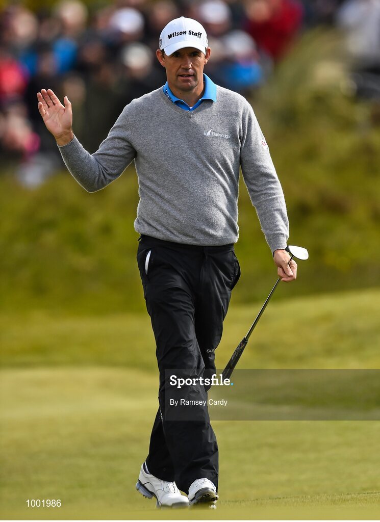 29 May 2015; Padraig Harrington, Ireland, after a birdie putt on the 18th hole. Dubai Duty Free Irish Open Golf Championship 2015, Day 2. Royal County Down Golf Club, Co. Down. Picture credit: Ramsey Cardy / SPORTSFILE