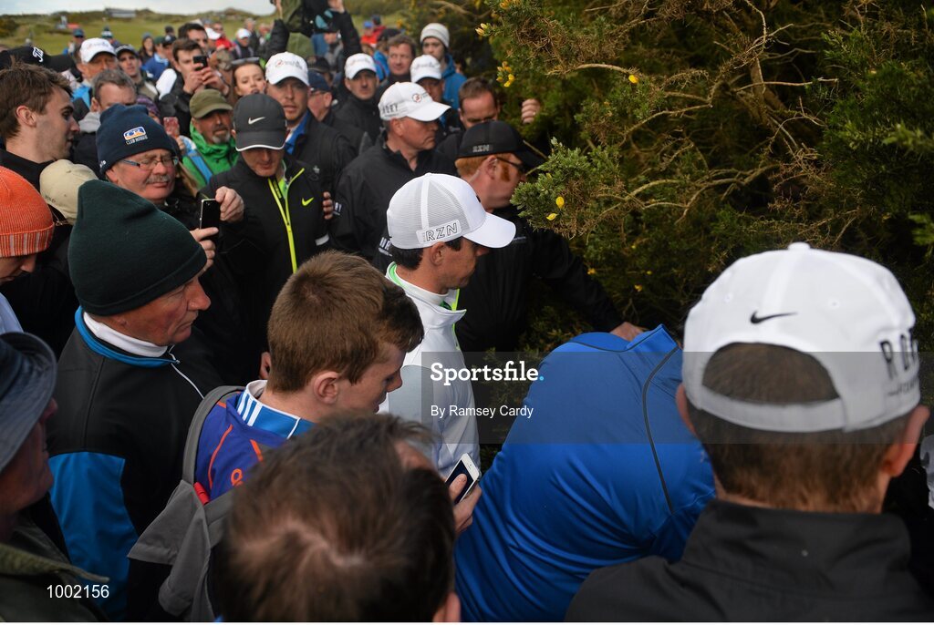29 May 2015; Rory McIlroy, Northern Ireland, centre, searches for his ball off the 18th fairway. Dubai Duty Free Irish Open Golf Championship 2015, Day 2. Royal County Down Golf Club, Co. Down. Picture credit: Ramsey Cardy / SPORTSFILE