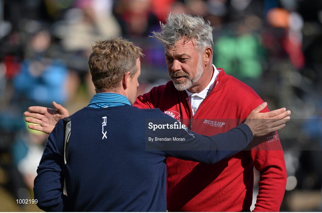 29 May 2015; Darren Clarke, right, Northern Ireland, and Luke Donald, England, after finishing their respective rounds. Dubai Duty Free Irish Open Golf Championship 2015, Day 2. Royal County Down Golf Club, Co. Down. Picture credit: Brendan Moran / SPORTSFILE