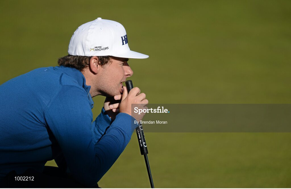 29 May 2015; Tyrrell Hatton, England, likes up a putt on his way to a birdie on the 18th green for a course record 66. Dubai Duty Free Irish Open Golf Championship 2015, Day 2. Royal County Down Golf Club, Co. Down. Picture credit: Brendan Moran / SPORTSFILE
