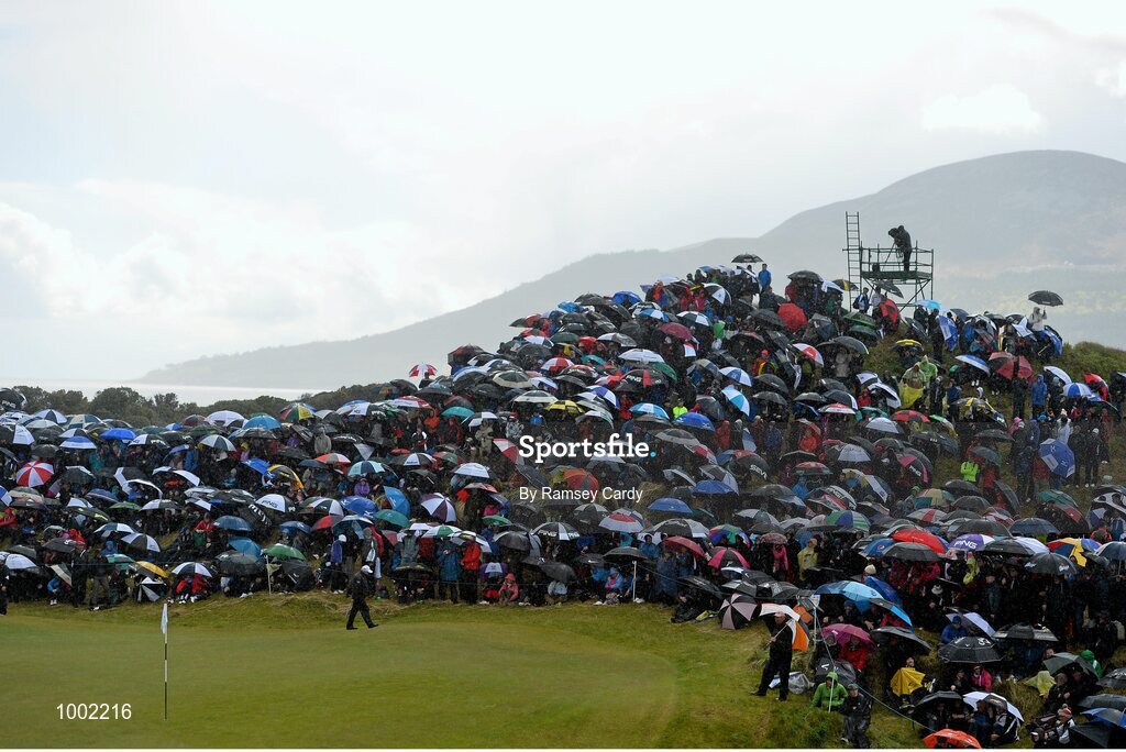 29 May 2015; Large crowds at the 5th green take shelter from heavy rain. Dubai Duty Free Irish Open Golf Championship 2015, Day 2. Royal County Down Golf Club, Co. Down. Picture credit: Ramsey Cardy / SPORTSFILE