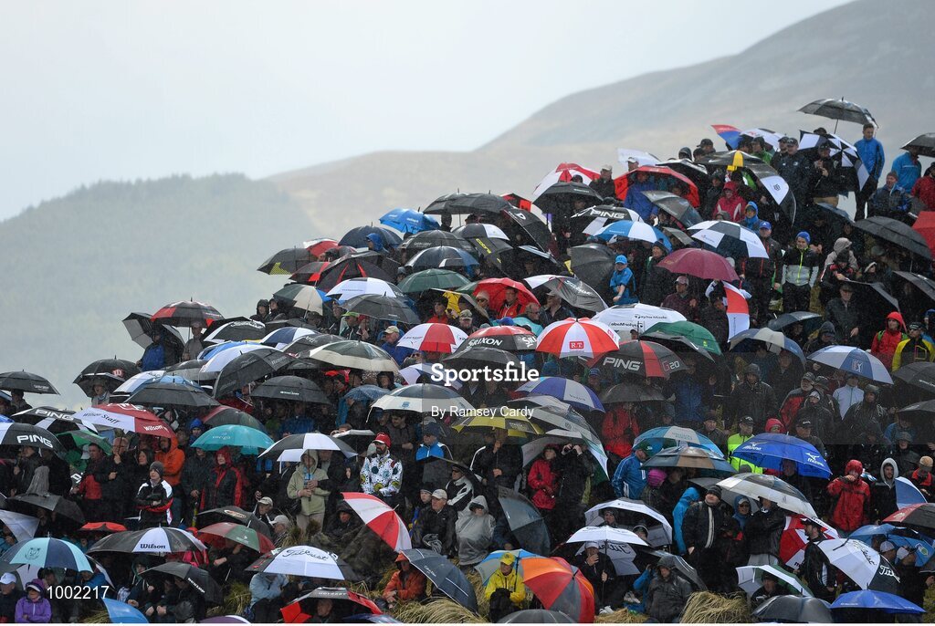 29 May 2015; Large crowds at the 5th green take shelter from heavy rain. Dubai Duty Free Irish Open Golf Championship 2015, Day 2. Royal County Down Golf Club, Co. Down. Picture credit: Ramsey Cardy / SPORTSFILE