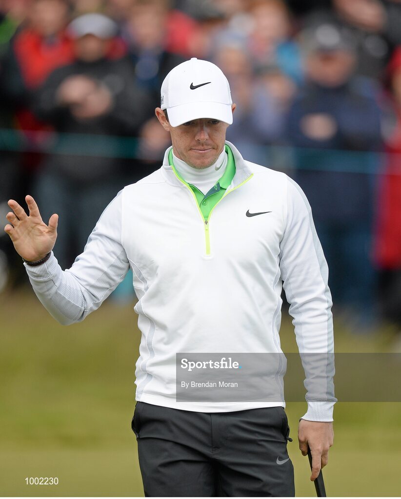 29 May 2015; Rory McIlroy, Northern Ireland, acknowledges the applause from the gallery on the 18th green after finishing his round with a 71. Dubai Duty Free Irish Open Golf Championship 2015, Day 2. Royal County Down Golf Club, Co. Down. Picture credit: Brendan Moran / SPORTSFILE