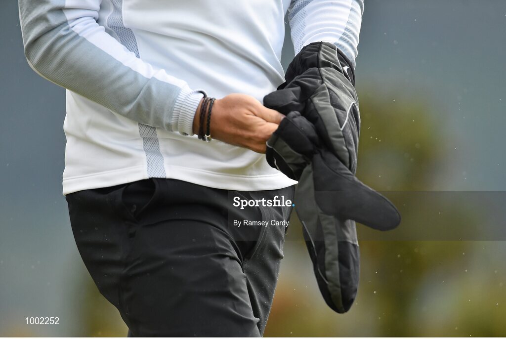 29 May 2015; Rory McIlroy puts on gloves during heavy rain. Dubai Duty Free Irish Open Golf Championship 2015, Day 2. Royal County Down Golf Club, Co. Down. Picture credit: Ramsey Cardy / SPORTSFILE