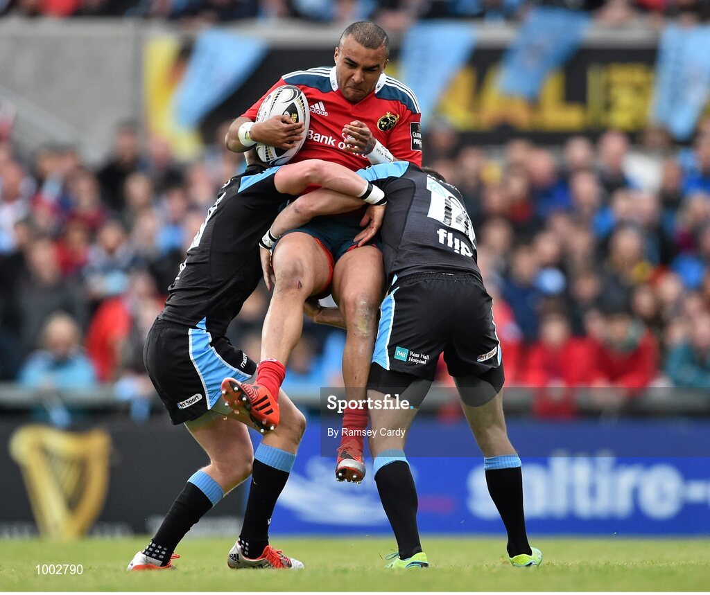 30 May 2015; Simon Zebo, Munster, is tackled by Finn Russell, left, and Tommy Seymour, Glasgow Warriors. Guinness PRO12 Final, Munster v Glasgow Warriors. Kingspan Stadium, Ravenhill Park, Belfast. Picture credit: Ramsey Cardy / SPORTSFILE