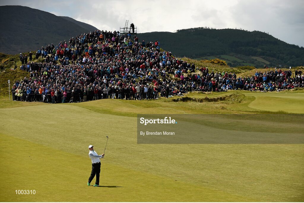 29 May 2015; Rory McIlroy, Northern Ireland, watches his second shot on the 2nd fairway in front of a large gallery. Dubai Duty Free Irish Open Golf Championship 2015, Day 2. Royal County Down Golf Club, Co. Down. Picture credit: Brendan Moran / SPORTSFILE