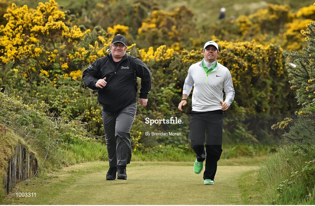 29 May 2015; Rory McIlroy, Northern Ireland, makes his way to the 4th tee box, accompanied by a security guard. Dubai Duty Free Irish Open Golf Championship 2015, Day 2. Royal County Down Golf Club, Co. Down. Picture credit: Brendan Moran / SPORTSFILE