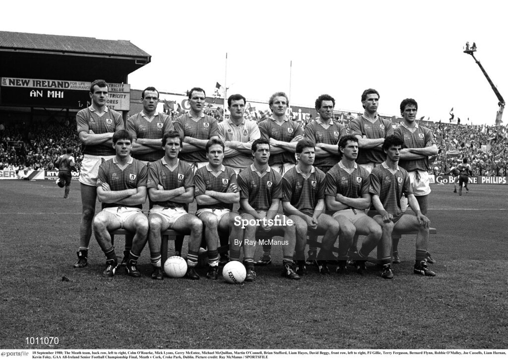 18 September 1988; The Meath team, back row, left to right, Colm O'Rourke, Mick Lyons, Gerry McEntee, Michael McQuillan, Martin O'Connell, Brian Stafford, Liam Hayes, David Beggy, front row, left to right, P.J Gillic, Mattie McCabe, Bernard Flynn, Padraig Lyons, Robbie O'Malley, Liam Harnan, Kevin Foley.. GAA All-Ireland Senior Football Championship Final, Meath v Cork, Croke Park, Dublin. Picture credit: Ray McManus / SPORTSFILE