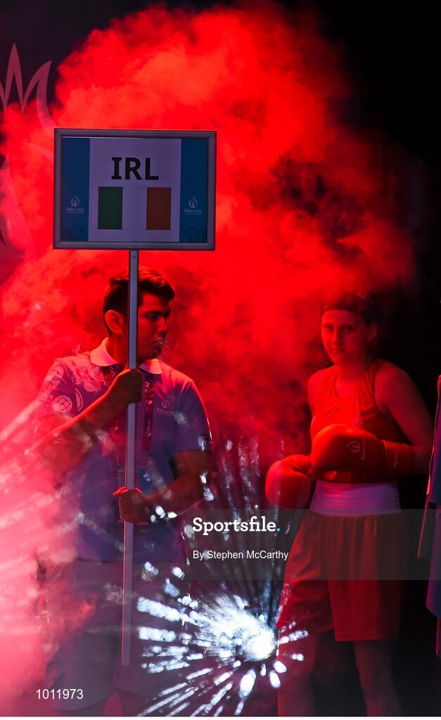 20 June 2015; Michaela Walsh, Ireland, before her Women's Boxing Bantam 54kg Round of 16 bout with Elena Saveleva, Russia. 2015 European Games, Crystal Hall, Baku, Azerbaijan. Picture credit: Stephen McCarthy / SPORTSFILE