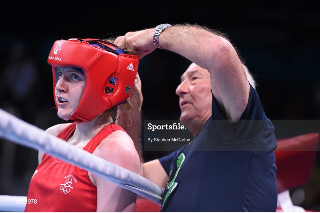 20 June 2015; Michaela Walsh, Ireland, has her head gear strapped up by coach Gerry Storey during her Women's Boxing Bantam 54kg Round of 16 bout with Elena Saveleva, Russia. 2015 European Games, Crystal Hall, Baku, Azerbaijan. Picture credit: Stephen McCarthy / SPORTSFILE