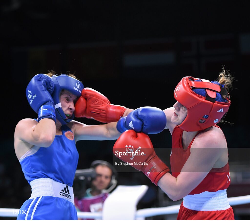 20 June 2015; Michaela Walsh, Ireland, right, exchanges punches with Elena Saveleva, Russia, during their Women's Boxing Bantam 54kg Round of 16 bout. 2015 European Games, Crystal Hall, Baku, Azerbaijan. Picture credit: Stephen McCarthy / SPORTSFILE