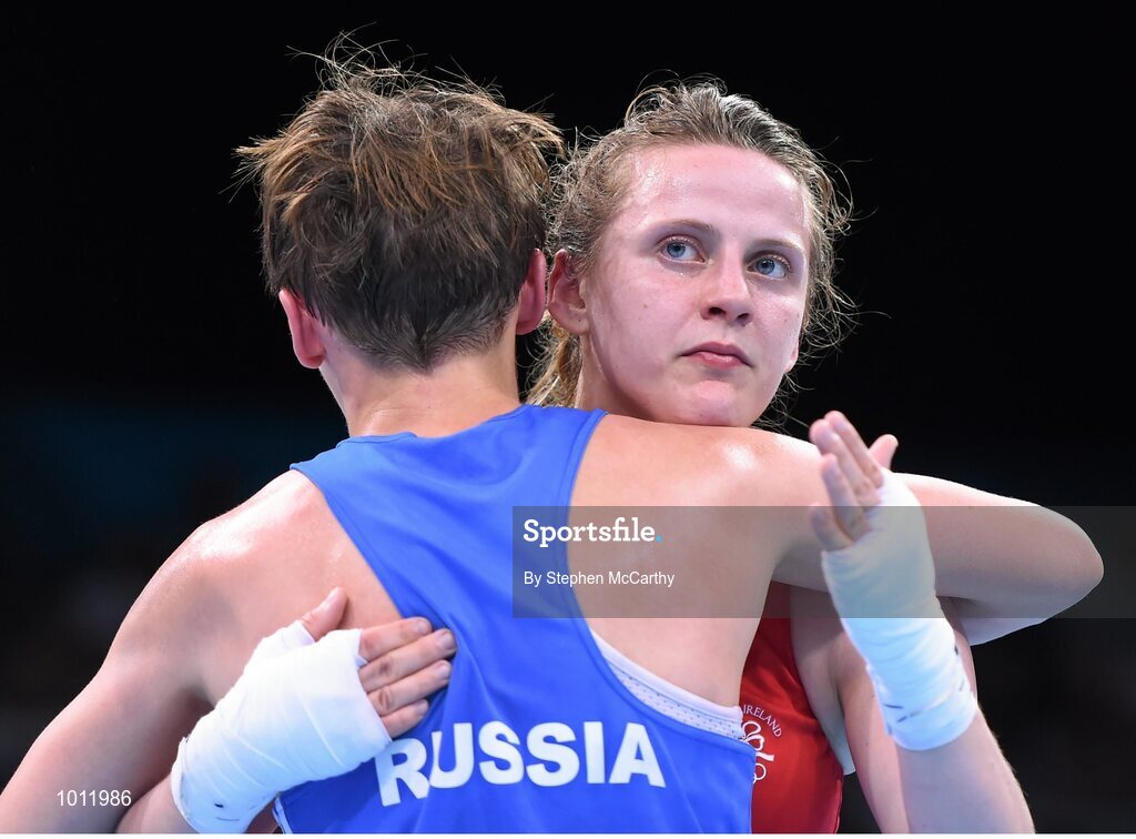20 June 2015; Michaela Walsh, Ireland, right, and Elena Saveleva, Russia, following their Women's Boxing Bantam 54kg Round of 16 bout. 2015 European Games, Crystal Hall, Baku, Azerbaijan. Picture credit: Stephen McCarthy / SPORTSFILE