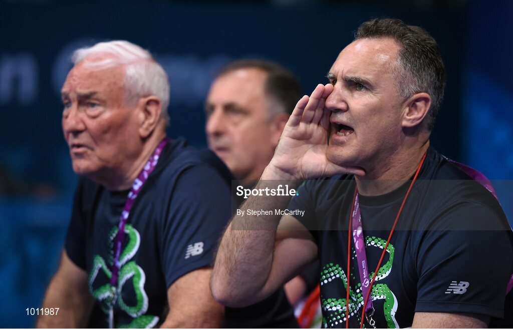 20 June 2015; Team Ireland coaches Billy Walsh, right, Gerry Storey, left, and Zaur Antia watch on as Michaela Walsh, Ireland, takes on Elena Saveleva, Russia during her Women's Boxing Bantam 54kg Round of 16 bout. 2015 European Games, Crystal Hall, Baku, Azerbaijan. Picture credit: Stephen McCarthy / SPORTSFILE