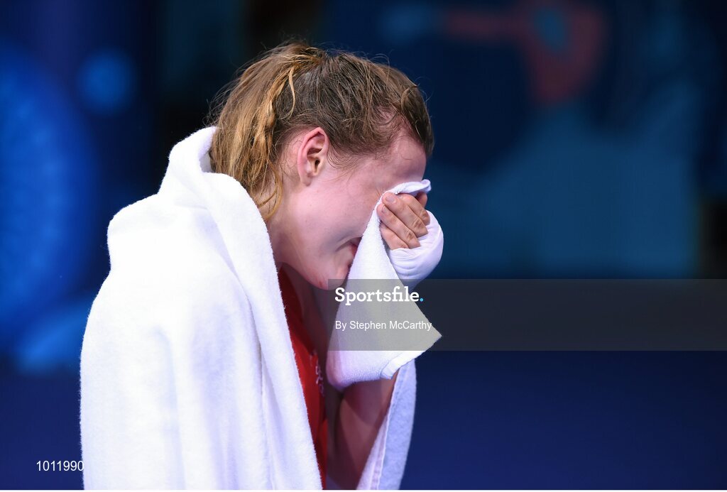 20 June 2015; Michaela Walsh, Ireland, reacts following her Women's Boxing Bantam 54kg Round of 16 bout with Elena Saveleva, Russia. 2015 European Games, Crystal Hall, Baku, Azerbaijan. Picture credit: Stephen McCarthy / SPORTSFILE