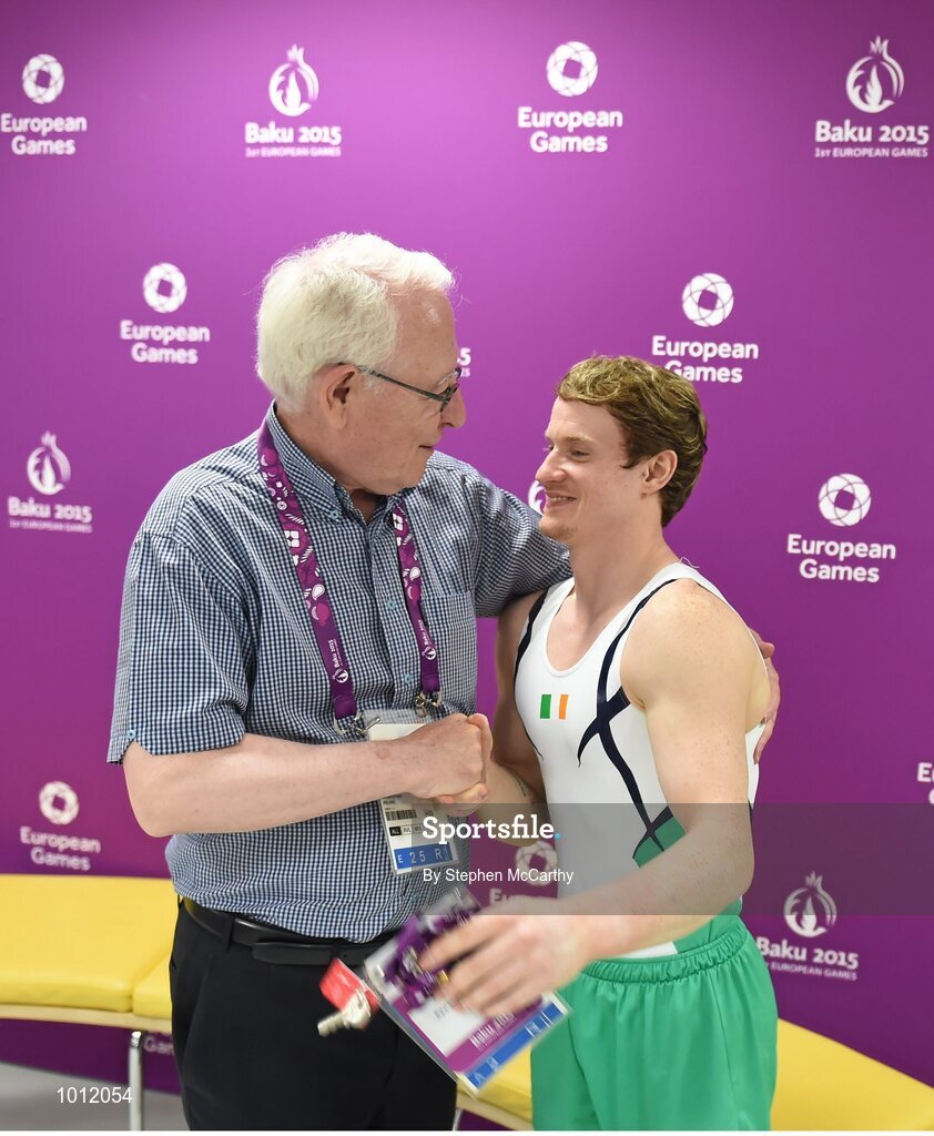 20 June 2015; Kieran Behan, Ireland, with Team Ireland Press Attaché Jack McGouran after competing in the final of the Artistic Gymnastics Men's Floor Exercise event. 2015 European Games, National Gymnastics Arena, Baku, Azerbaijan. Picture credit: Stephen McCarthy / SPORTSFILE