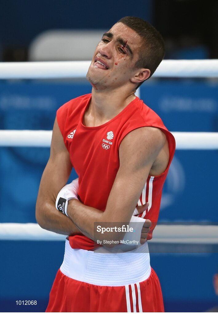 20 June 2015; Muhammad Ali, Great Britain, reacts after his Men's Boxing Fly 52kg Round of 16 bout with Vincenzo Picardi, Italy, was stopped due to a cut above his eye. 2015 European Games, Crystal Hall, Baku, Azerbaijan. Picture credit: Stephen McCarthy / SPORTSFILE