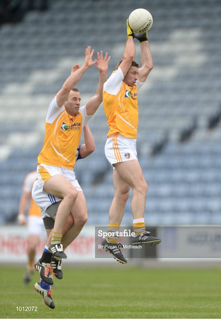 20 June 2015; Tony Scullion, Antrim, supported by team-mate Michael Pollock, gathers possession ahead of Stephen Attride, Laois. GAA Football All-Ireland Senior Championship, Round 1A, Laois v Antrim, O'Moore Park, Portlaoise, Co. Laois. Picture credit: Piaras Ó Mídheach / SPORTSFILE