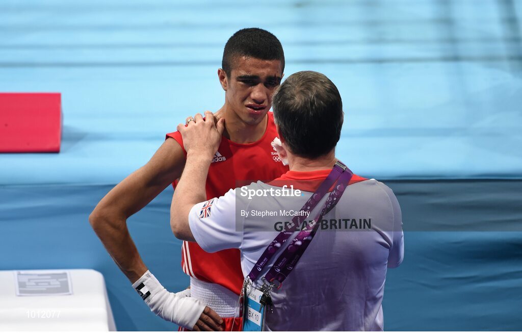 20 June 2015; Muhammad Ali, Great Britain, his treated for a cut after his Men's Boxing Fly 52kg Round of 16 bout with Vincenzo Picardi, Italy, was stopped. 2015 European Games, Crystal Hall, Baku, Azerbaijan. Picture credit: Stephen McCarthy / SPORTSFILE