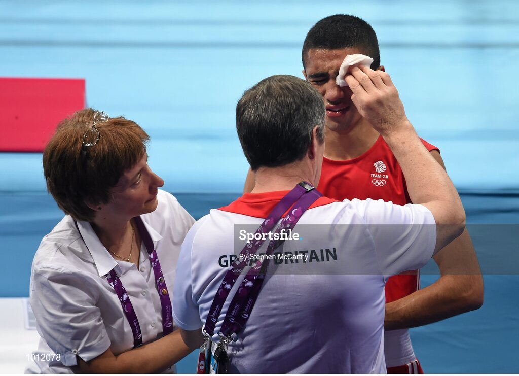 20 June 2015; Muhammad Ali, Great Britain, his treated for a cut after his Men's Boxing Fly 52kg Round of 16 bout with Vincenzo Picardi, Italy, was stopped. 2015 European Games, Crystal Hall, Baku, Azerbaijan. Picture credit: Stephen McCarthy / SPORTSFILE