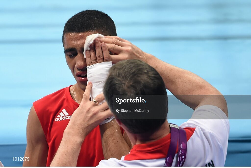 20 June 2015; Muhammad Ali, Great Britain, his treated for a cut after his Men's Boxing Fly 52kg Round of 16 bout with Vincenzo Picardi, Italy, was stopped. 2015 European Games, Crystal Hall, Baku, Azerbaijan. Picture credit: Stephen McCarthy / SPORTSFILE