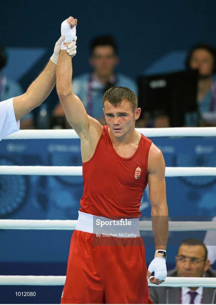 20 June 2015; Miklos Varga, Hungary, is announced victorious over Konstantin Bogomazov, Russia, following their Men's Boxing Light 60kg Round of 16 bout. 2015 European Games, Crystal Hall, Baku, Azerbaijan. Picture credit: Stephen McCarthy / SPORTSFILE