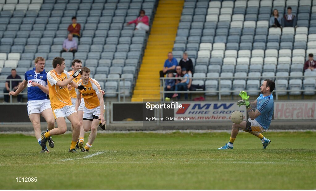 20 June 2015; Antrim goalkeeper Chris Kerr saves a shot from Donal Kingston, Laois. GAA Football All-Ireland Senior Championship, Round 1A, Laois v Antrim, O'Moore Park, Portlaoise, Co. Laois. Picture credit: Piaras Ó Mídheach / SPORTSFILE