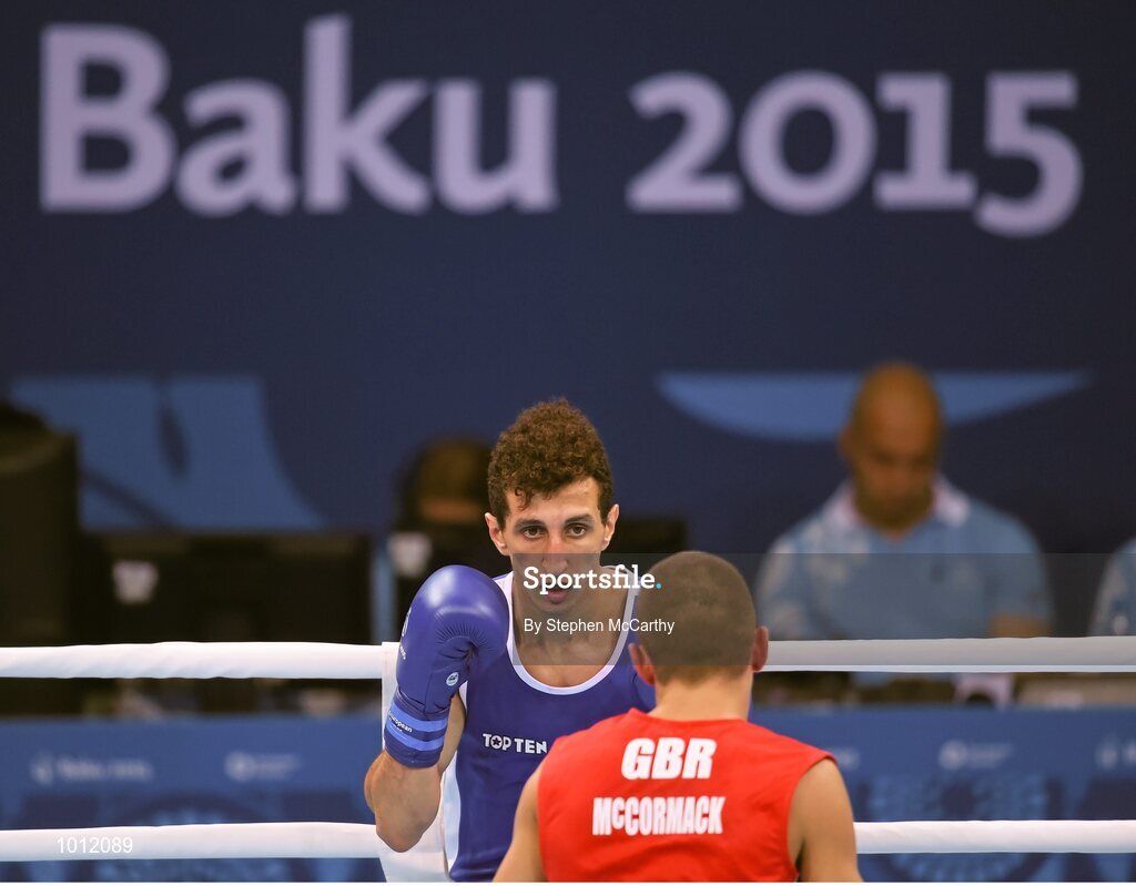 20 June 2015; Sofiane Oumiha, France, left, exchanges punches with Luke McCormack, Great Britain, during their Men's Boxing Light 60kg Round of 16 bout. 2015 European Games, Crystal Hall, Baku, Azerbaijan. Picture credit: Stephen McCarthy / SPORTSFILE