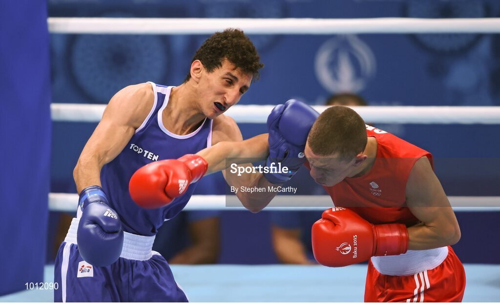 20 June 2015; Sofiane Oumiha, France, left, exchanges punches with Luke McCormack, Great Britain, during their Men's Boxing Light 60kg Round of 16 bout. 2015 European Games, Crystal Hall, Baku, Azerbaijan. Picture credit: Stephen McCarthy / SPORTSFILE