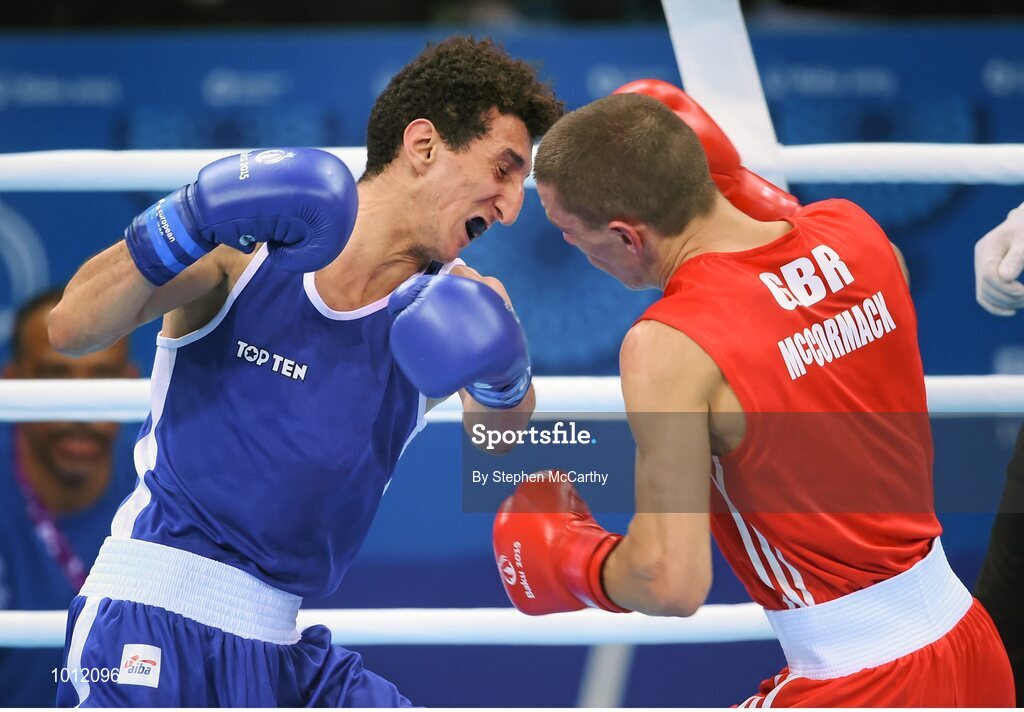 20 June 2015; Sofiane Oumiha, France, left, exchanges punches with Luke McCormack, Great Britain, during their Men's Boxing Light 60kg Round of 16 bout. 2015 European Games, Crystal Hall, Baku, Azerbaijan. Picture credit: Stephen McCarthy / SPORTSFILE