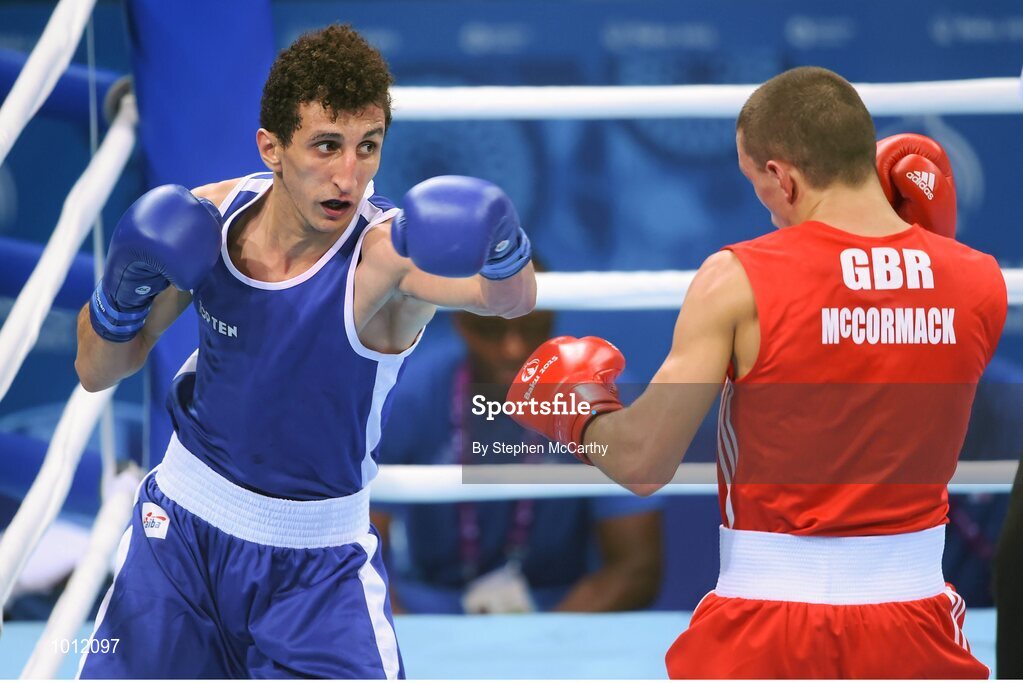 20 June 2015; Sofiane Oumiha, France, left, exchanges punches with Luke McCormack, Great Britain, during their Men's Boxing Light 60kg Round of 16 bout. 2015 European Games, Crystal Hall, Baku, Azerbaijan. Picture credit: Stephen McCarthy / SPORTSFILE