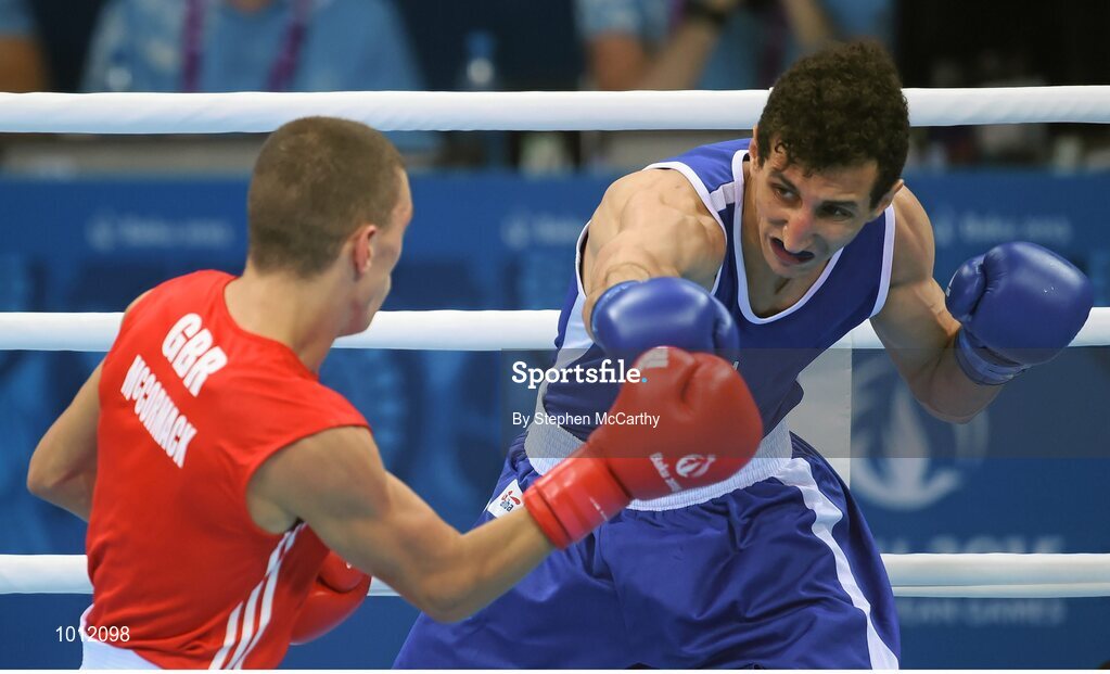 20 June 2015; Sofiane Oumiha, France, right, exchanges punches with Luke McCormack, Great Britain, during their Men's Boxing Light 60kg Round of 16 bout. 2015 European Games, Crystal Hall, Baku, Azerbaijan. Picture credit: Stephen McCarthy / SPORTSFILE