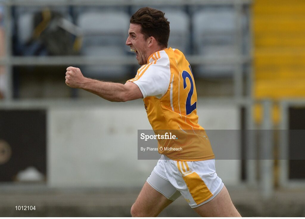 20 June 2015; Antrim's Ryan Murray celebrates after scoring his side's first goal. GAA Football All-Ireland Senior Championship, Round 1A, Laois v Antrim, O'Moore Park, Portlaoise, Co. Laois. Picture credit: Piaras Ó Mídheach / SPORTSFILE