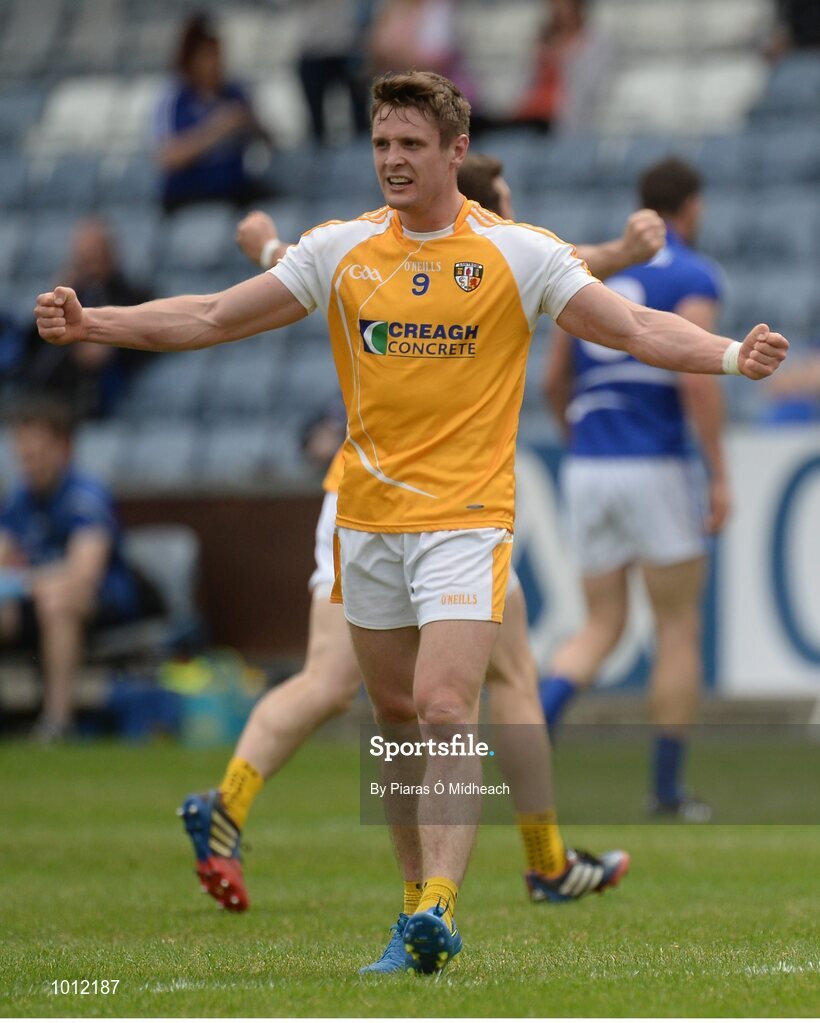 20 June 2015; Antrim's Mark Sweeney celebrates victory at the final whistle. GAA Football All-Ireland Senior Championship, Round 1A, Laois v Antrim, O'Moore Park, Portlaoise, Co. Laois. Picture credit: Piaras Ó Mídheach / SPORTSFILE
