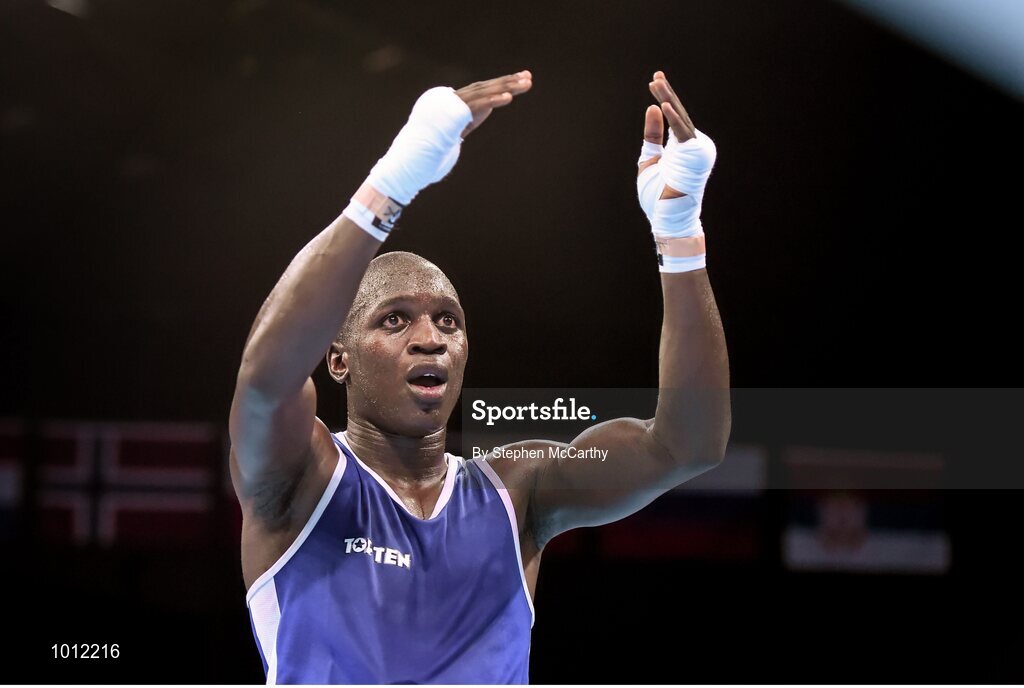 20 June 2015; Souleymane Cissokho, France, celebrates his Men's Boxing Welter 69kg Round of 16 bout victory over Balazs Bacskai, Hungary. 2015 European Games, Crystal Hall, Baku, Azerbaijan. Picture credit: Stephen McCarthy / SPORTSFILE