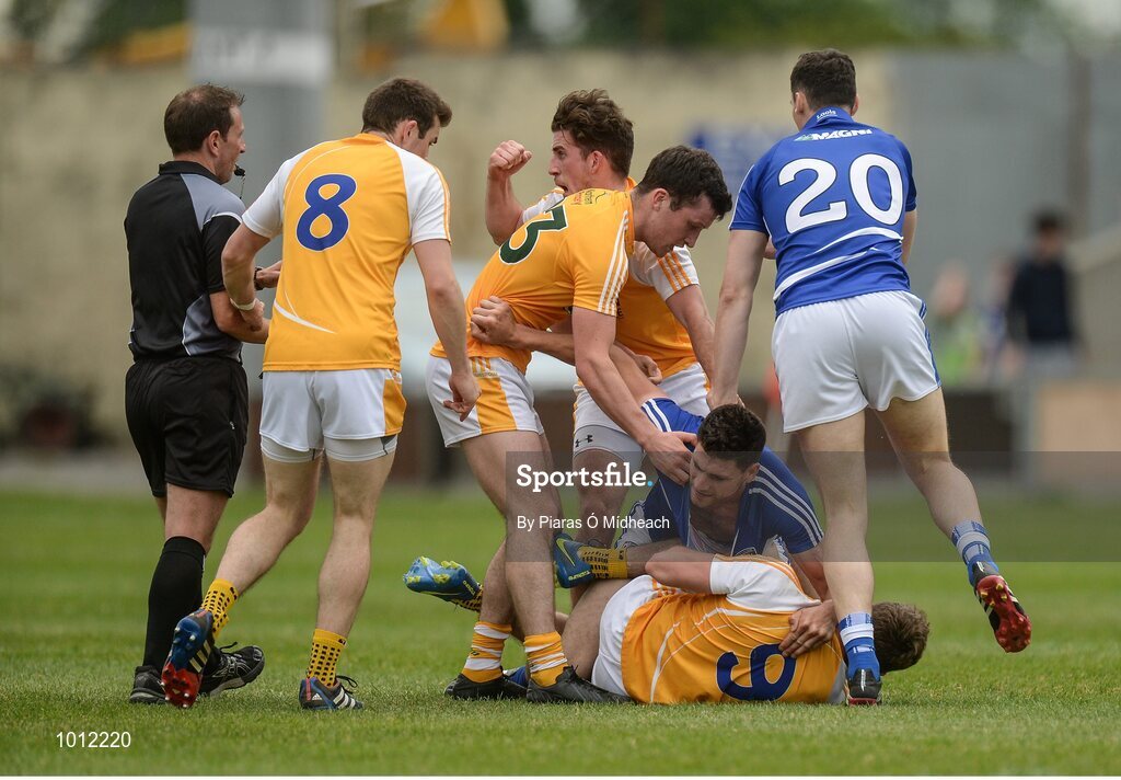 20 June 2015; Brendan Quigley, Laois, and Mark Sweeney, Antrim, in a tussle late in the game before Quigley was shown the red card by referee Derek O'Mahoney. GAA Football All-Ireland Senior Championship, Round 1A, Laois v Antrim, O'Moore Park, Portlaoise, Co. Laois. Picture credit: Piaras Ó Mídheach / SPORTSFILE