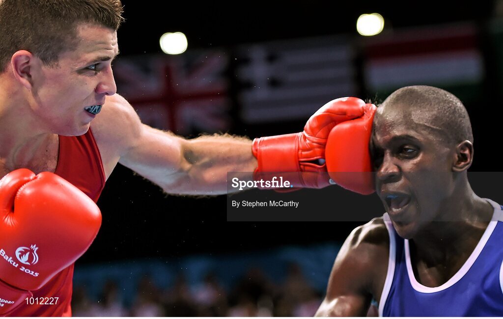 20 June 2015; Balazs Bacskai, Hungary, lands a left on Souleymane Cissokho, France, during their Men's Boxing Welter 69kg Round of 16 bout. 2015 European Games, Crystal Hall, Baku, Azerbaijan. Picture credit: Stephen McCarthy / SPORTSFILE
