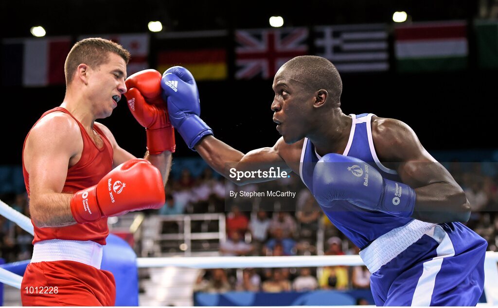 20 June 2015; Souleymane Cissokho, France, right, exchanges punches with Balazs Bacskai, Hungary, during their Men's Boxing Welter 69kg Round of 16 bout. 2015 European Games, Crystal Hall, Baku, Azerbaijan. Picture credit: Stephen McCarthy / SPORTSFILE