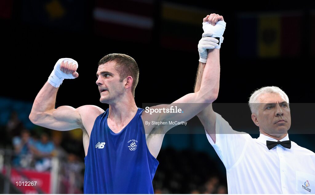 20 June 2015; Adam Nolan, Ireland, is announced victorious by referee Vladyslav Malyshev following his Men's Boxing Welter 69kg Round of 16 bout with Dario Morello, Italy. 2015 European Games, Crystal Hall, Baku, Azerbaijan. Picture credit: Stephen McCarthy / SPORTSFILE
