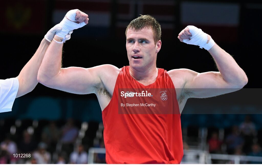 20 June 2015; Dean Gardiner, Ireland, is announced victorious following his Men's Boxing Super Heavy +91kg Round of 16 bout with Guido Vianello, Italy. 2015 European Games, Crystal Hall, Baku, Azerbaijan. Picture credit: Stephen McCarthy / SPORTSFILE