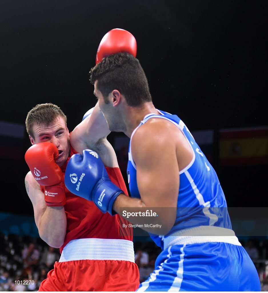 20 June 2015; Dean Gardiner, Ireland, left, exchanges punches with Guido Vianello, Italy, during their Men's Boxing Super Heavy +91kg Round of 16 bout. 2015 European Games, Crystal Hall, Baku, Azerbaijan. Picture credit: Stephen McCarthy / SPORTSFILE