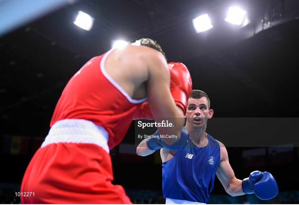 20 June 2015; Adam Nolan, Ireland, right, exchanges punches with Dario Morello, Italy, during their Men's Boxing Welter 69kg Round of 16 bout. 2015 European Games, Crystal Hall, Baku, Azerbaijan. Picture credit: Stephen McCarthy / SPORTSFILE